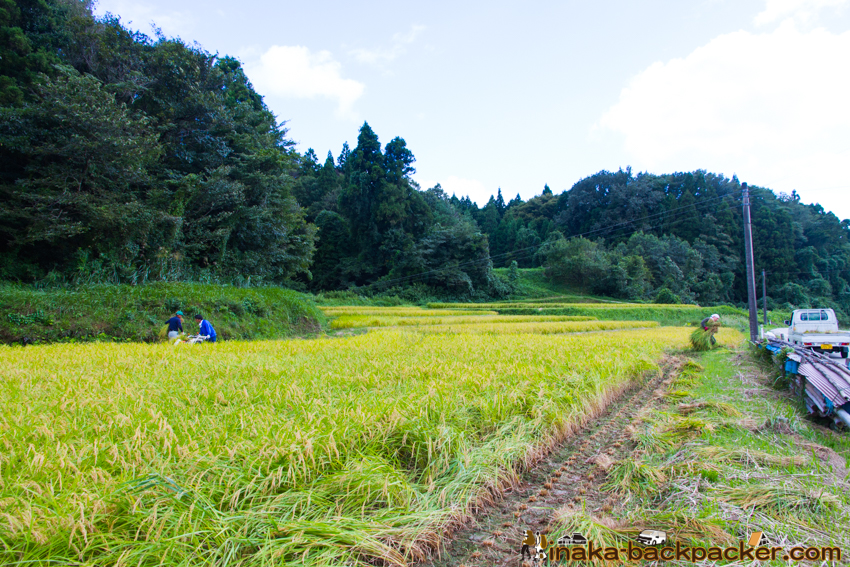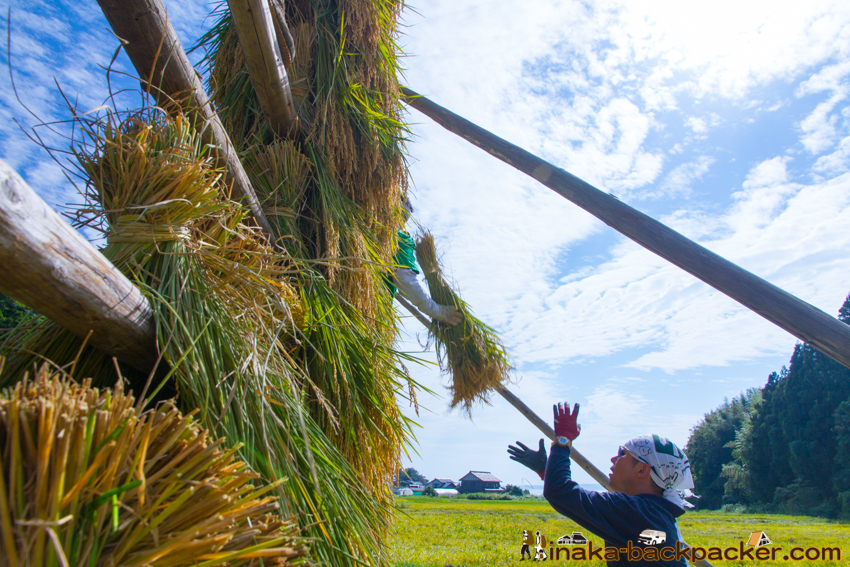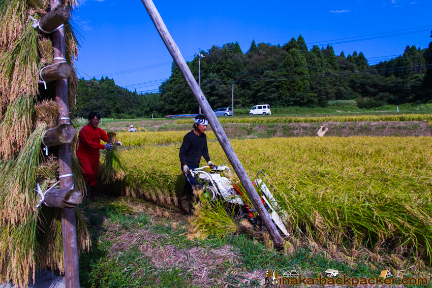 写真で見るNPO法人「田舎時間」の活動 <2015年8月: 稲架づくり><2015年9月: 稲刈り・稲架干し作業> |